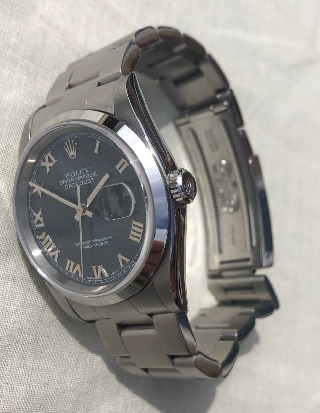 Rolex Datejust offered for sale. This is a 36mm stainless steel, and is rare with its blue face and roman numerals.